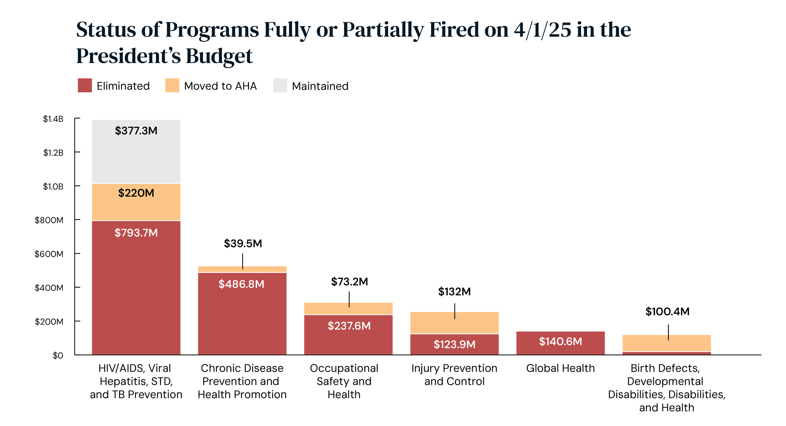 Firing entire subprograms within programs slated for elimination, even though Congress fully funded them. Of the offices that were RIF’d on April 1, 2025 completely or partially, 87% were either slated for elimination (66%) or to move to AHA (21%) in the President’s Budget.
